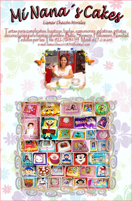 Aquí, en el sur de Tenerife, mi amiga Lismar elabora las tartas más hermosas, rellenas de un rico dulce de leche y un bizcocho esponjoso y suculento. He probado sus tartas y os aseguro, son ricas, muy ricas por cierto. Ella es una profesional del entretenimiento infantil, realiza también piñatas y decoración con el motivo similar a la tarta, ¡Incluso es payasita!., maquilla a los niños con el motivo que deseen, los entretiene con juegos muy interactivos, no para de bailar y lo que más le caracteriza... siempre está alegre. Para redondear, una genial oportunidad hacer de las fiestas de vuestros hijos el mejor de su vida.